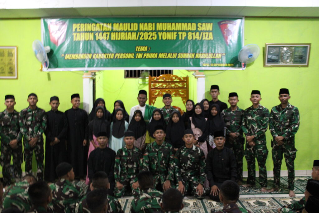 Peringatan Maulid Nabi Muhammad SAW 1447 H/2025 di Yonif TP 814/JZA berlangsung penuh kekhidmatan dan makna spiritual di Masjid Hisbul Waton, Distrik Yapsi, Jayapura. Acara ini tak hanya menghadirkan tausiah dari Kepala KUA Distrik Yapsi, tetapi juga menyentuh hati para prajurit melalui penampilan hadroh oleh anak-anak TPQ dari tingkat SD hingga SMA. Para prajurit mengaku termotivasi memperkuat keimanan dan menjadikan momen ini sebagai pengingat pentingnya kekuatan rohani di tengah tugas negara. Kegiatan ini juga menjadi bagian dari pembinaan mental prajurit, yang diperkuat dengan rutinitas ibadah berjamaah di lingkungan batalyon.